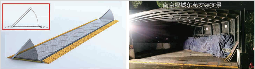 无水时,挡水板伏卧在地面框体上。车辆可以正常通行。