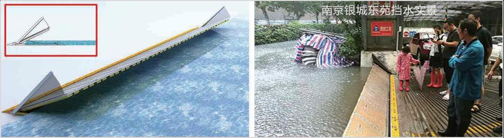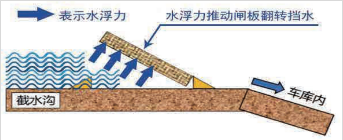 当洪水来袭时,由于挡水板正义密度小于水,挡水板在迎面洪水浮力作用下,自动翻转成直立状态而挡住洪水。挡水过程无需电力驱动。